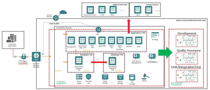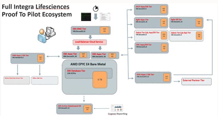 Integra’s systems are complex and highly integrated, and as with any large-scale enterprise, extensive testing must be performed before releasing into production use. The Integra P2P focused on migration of E-Business Suite and its ecosystem components (Agile, ASCP, and GRC) while utilizing Exadata Cloud for the database tier. Integra’s success criteria centered on typical operations, month end report performance, overall functionality, and management of these systems. The following graphic shows the architecture:
