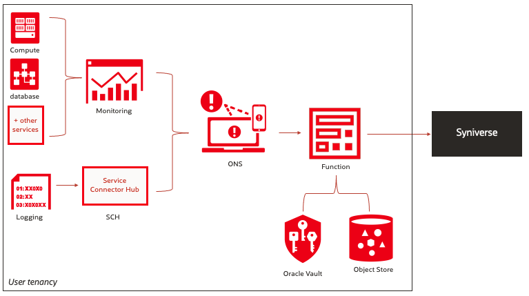 The solution that we provide uses the Notifications service to deliver notifications of events and alarms to a function that can call Syniverse SMS API to send the SMS message. We build a production-ready solution where everything is parameterized and included Object Storage, where we stored the phone numbers to send the SMS and Oracle Vaults to store the Syniverse API credentials.