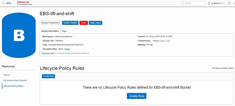 To create lifecycle policies by using the Oracle Cloud Infrastructure Console, sign in to the Console and select the Object Storage bucket that you want to define the lifecycle policy on.