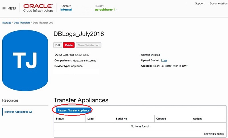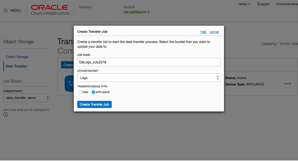 To request an appliance, log into the Oracle Cloud Infrastructure Console and create a Transfer Job of the type Appliance, in a region of your choice. While creating the Transfer Job, you must also specify the bucket to which the data must be uploaded. Currently, all data from a single transfer appliance can be uploaded to only one bucket.