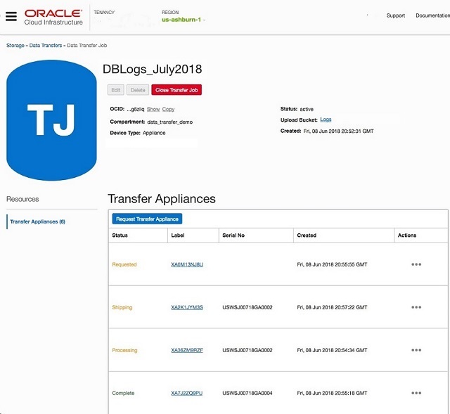 Using the Oracle Cloud Console or the Data Transfer Utility, you can track the status of the data transfer process throughout its lifecycle, from the time you requested the appliance to the time the data is uploaded to your Oracle cloud tenancy.