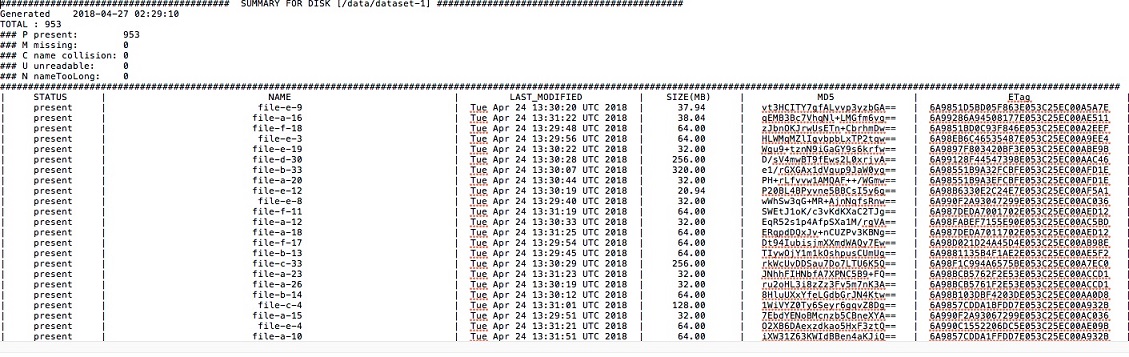 When Oracle processes your transfer appliance and uploads data to your Oracle cloud tenancy, a data upload summary is posted to the same bucket where the data was uploaded. The following is a sample of the upload summary: