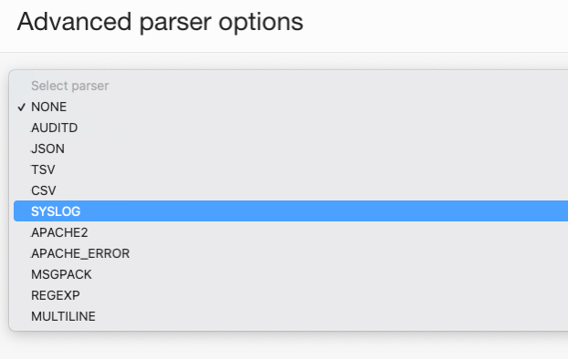 In this same section, click Advanced Parser Options and choose syslog in the parser list.