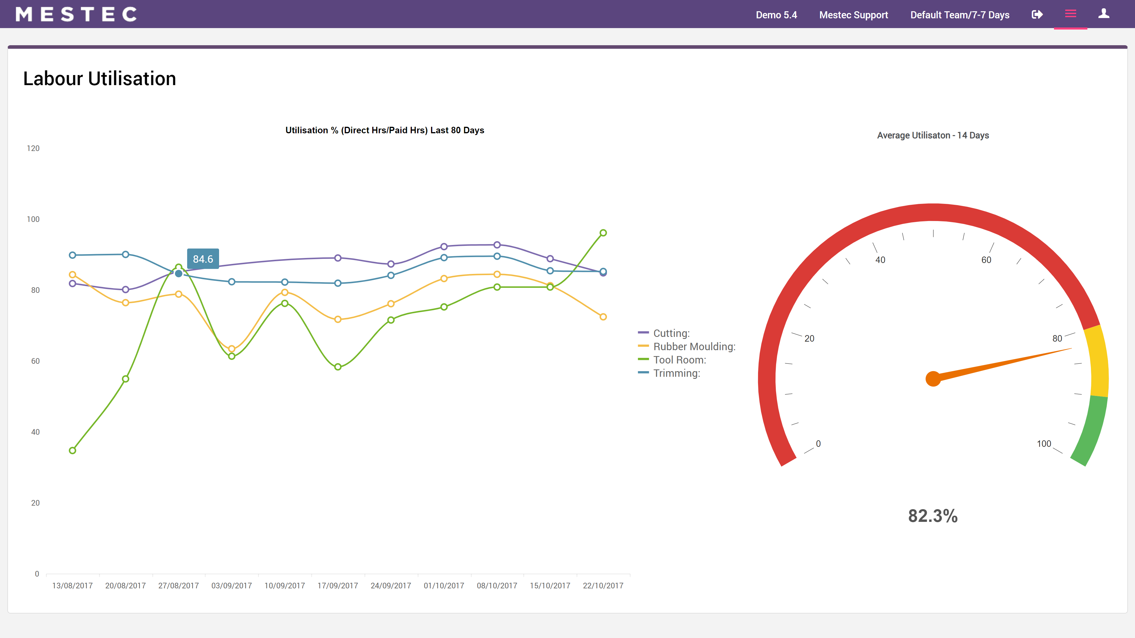 Fig 1. MESTEC’s labor utilization dashboard tracks manufacturing processes that can impede productivity. These insights help manufacturers plan better to improve manufacturing processes to increase productivity.
