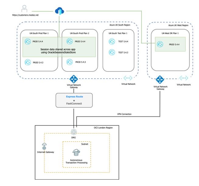 In terms of cloud deployment, MESTEC took a very structured approach to their multicloud journey with a combination of Microsoft Azure and OCI. MESTEC’s front-end web applications are delivered through Azure WebApps and hosted in two Azure regions. Both regions connect to OCI through the Azure Interconnect. MESTEC leveraged the Interconnect based on Oracle and Microsoft’s respective FastConnect and ExpressRoute services to create private connections between the workloads distributed across the two clouds to offer speed and a secure connection. With this solution, MESTEC was able to achieve high availability and reliability through redundant 10-Gbps physical connections.