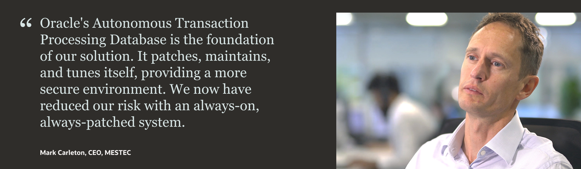 Additionally, with Oracle ATP, MESTEC also got access to an intelligent, highly available, and performant backend database system for its applications. Leveraging Oracle ATP specifically, there was no need to patch the database environment as ATP is always patched, practically requiring zero maintenance. Additionally, all data is encrypted at rest, which was not the case with their legacy environment. ATP also provided them a more secure and 100% compliant environment, reducing overall business risk while meeting regulatory compliance. The company is now able to run customer workloads much faster, reliably, and with zero downtime.