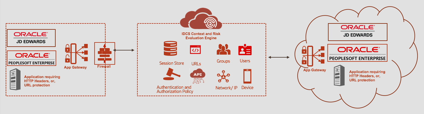 The IDCS App Gateway is an identity-aware proxy that can be placed in front of your applications. It has the ability to intercept HTTP/S requests, redirect users to IDCS for authentication and then inject validated user identity and authorization data as HTTP Headers into the request which is eventually sent to the application. An application can then use the vales of these HTTP headers to create a secured session for the end user. The IDCS App Gateway will also enable organizations to enforce URL authorization policies and help secure application APIs using OAuth.