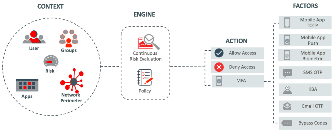 IDCS provides a market leading MFA solution through which organizations can define policies that contain context based rules and actions. These rules leverage the user, application, device, risk and request context to dynamically determine if a user is allowed access, denied access or needs to be prompted for MFA. The IDCS adaptive intelligence engine not only computes risk by analyzing login behavior but can also pulls in user risk feeds from UEBA systems such as Symantec CASB. It uses this combined risk score along with the user, application, device and request context to dynamically enforce access decisions.