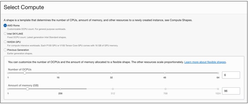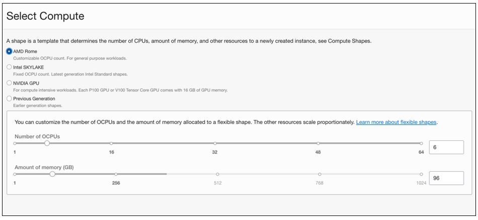Upon choosing the AMD Rome or the E3 Flex Shape, you can customize the number of OCPUs and memory in your instance.