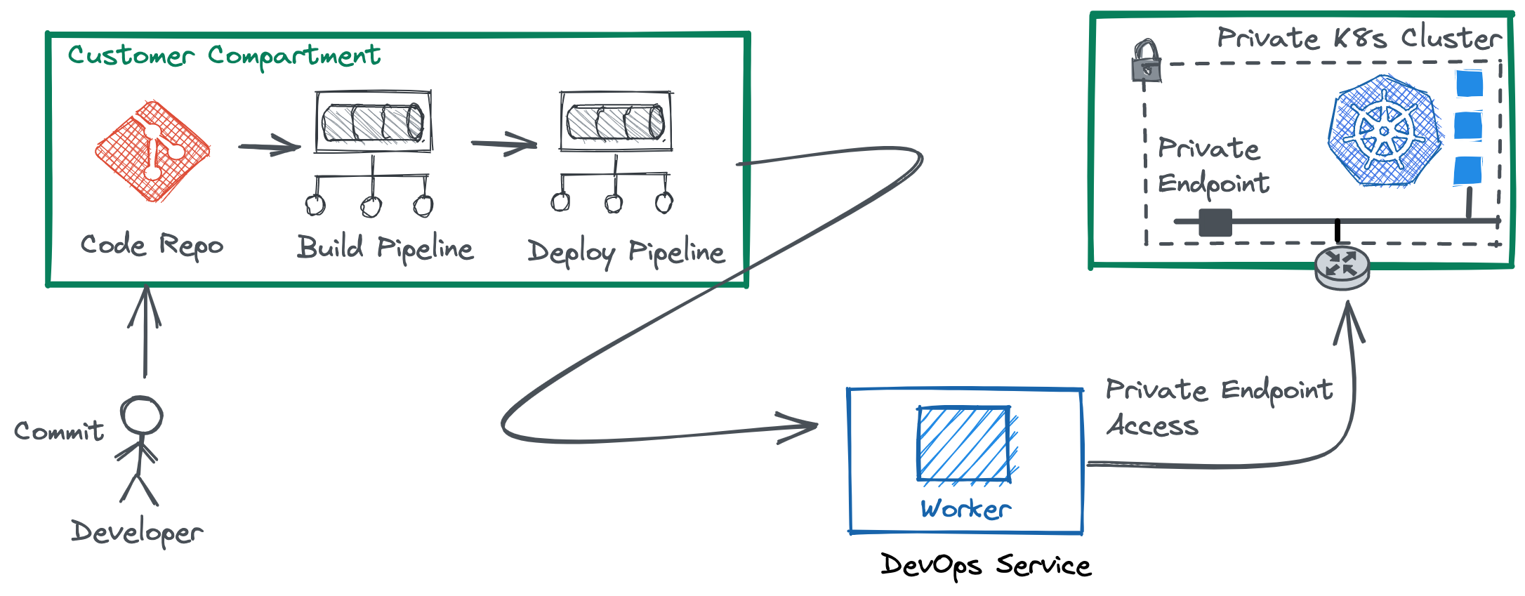 A CI/CD system that deploys applications to a Kubernetes cluster requires access to the cluster’s control plane. In a private Kubernetes cluster, the control plane is enabled on a VCN subnet that does not have access to the internet gateway. Customers have to either deploy agents or bridge the networking between the DevOps platform and the Kubernetes cluster via a jump host or bastion host to allow access to a private cluster. While these workarounds can enable access to the private cluster, they come with added compliance and operational overhead.