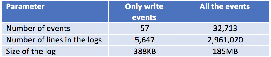 The following is a table that shows the number of write events vs all the events throughout the tenancy.