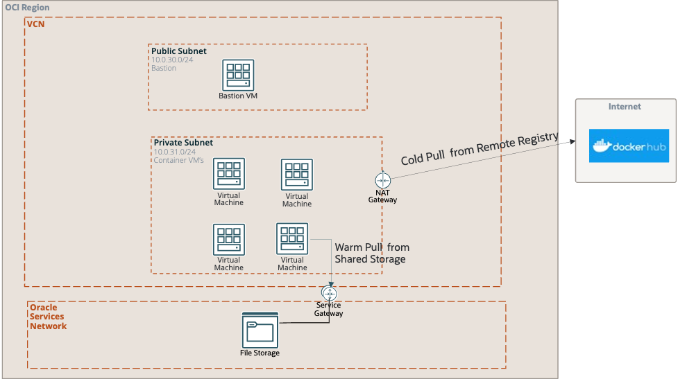 - For subsequent accesses, the image can be served as a “Warm Pull” directly from the local shared file storage, significantly improving speed and efficiency. This process is routed through a Service Gateway, which securely connects compute resources with Oracle Cloud services without traversing the public Internet.