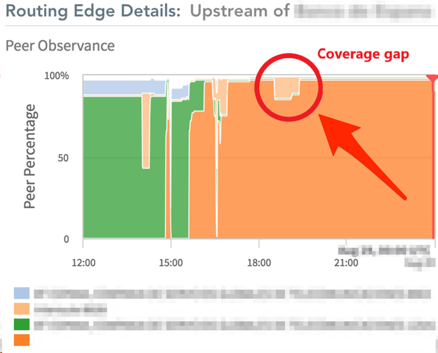 As the following image shows, despite the announcement change, there are still unprotected routes via an ISP, allowing some of the attack traffic through. The DDoS protection provider intercepted the IP blocks under attack, at around 16:00 local time.
