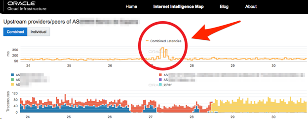 The attack, which intermittently affected access to a company’s website and services, was easily identified by Oracle’s vantage points and visible on the Internet Intelligence Map. In this example, as is typical with cloud-based DDoS protection, a cloud-based DDoS protection provider hijacked the organization’s IP blocks so that all the attack traffic was redirected to specialized DDoS scrubbing centers. During the IP block hijack, our security team measured a number of interesting statistics about the route instability, latency jump, and other artifacts caused by the traffic reroute.