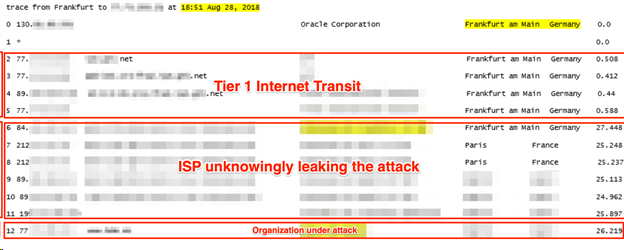 Additional visibility from trace routes confirms that not all routes were going through the DDoS protection. Two traces from London and Frankfurt confirm that some traffic was still routing through an ISP (instead of going entirely through the cloud-based DDoS mitigation provider).