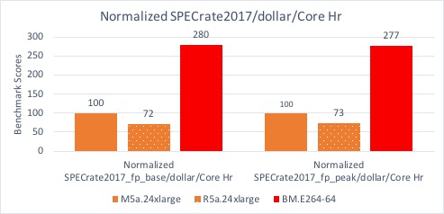 Figures 3 and 4 compare the normalized SPEC_fp/core and SPEC_fp/core/dollar between the Oracle instance and the AWS instances. The Oracle bare metal AMD instance performed 30 percent better than the best-performing AWS instance. Regarding price-performance, the Oracle AMD instance performed 280 percent better than the best of the AWS instances.