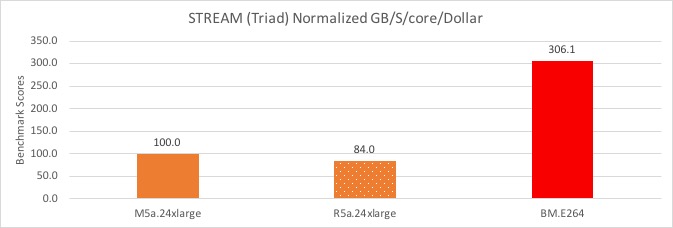 Figure 6: STREAM normalized GB/S/Core/Dollar comparison of Oracle AMD and AWS AMD instances