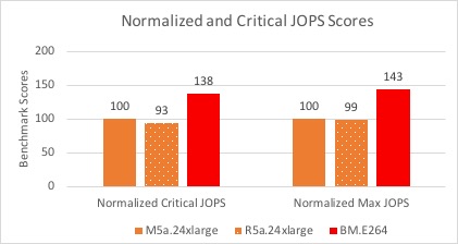 Figures 7 and 8 show the critical and max JOPS comparisons between the Oracle AMD instance and the AWS AMD instances. The Oracle AMD instance delivers 38 percent more normalized critical JOPS and 43 percent more max JOPS compared to the AWS AMD instances. Regarding price-performance, the Oracle AMD instance performed 296 percent better on critical JOPS and 308 percent better on max JOPS compared to the best AWS AMD instance.