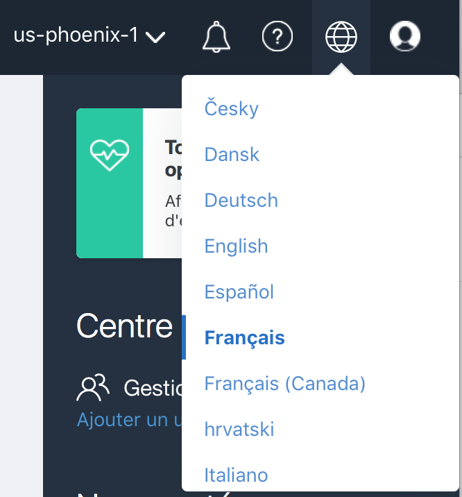 From any page in the console, click the globe icon on the upper-right corner of the screen to select your language. The language selections appear in the local language.