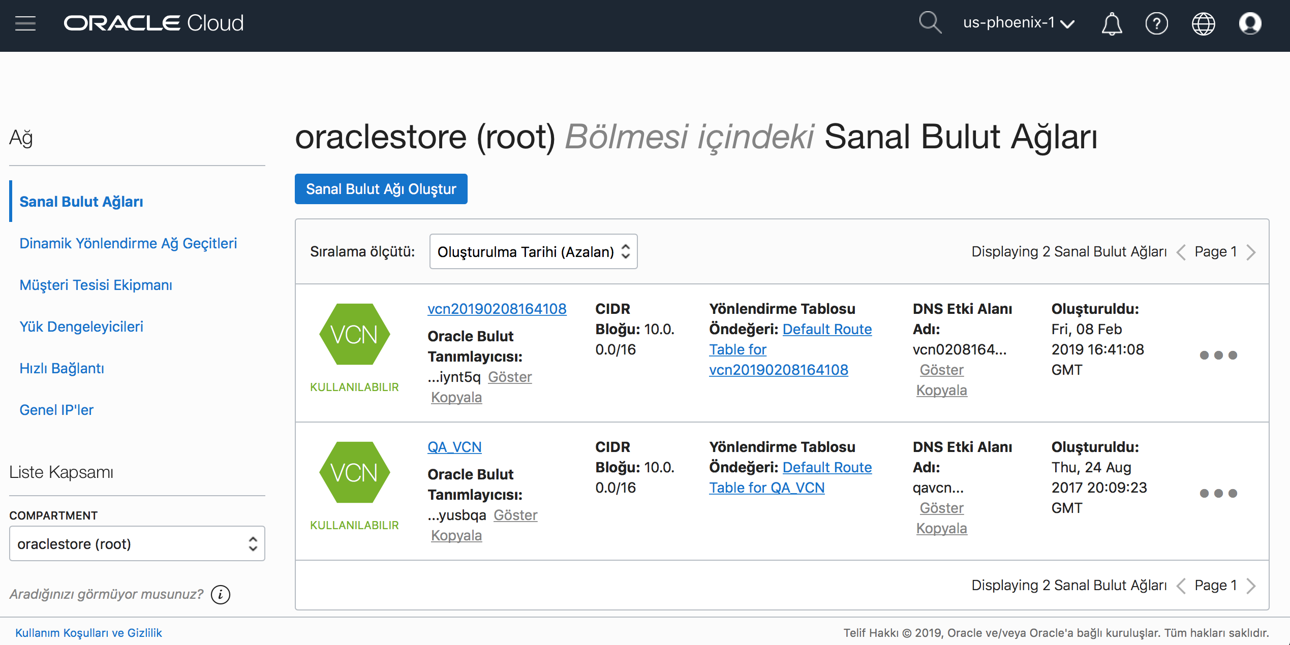 Now you can use your core IaaS and PaaS services—everything from Compute, Storage, and Networking to Autonomous Data Warehouse and Edge Services—in your language of choice. For example, the following example shows how you can manage your virtual cloud networks (VCNs) in Turkish.