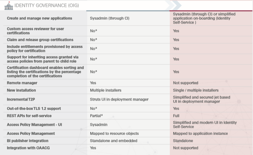 Oracle Identity Governance (OIG) 12c adds a number of features to simplify application on-boarding, accelerate moving to role based access management, manage data growth, and target certification campaigns to specific customer defined entitlements. 12c application on-boarding introduces schema discovery, which greatly reduces administrative effort to on-board new applications. Faster on-boarding means less effort on keeping compliant with regulatory requirements around life cycle management and certification reviews. Here are a few additional highlights on what’s new in OIG: