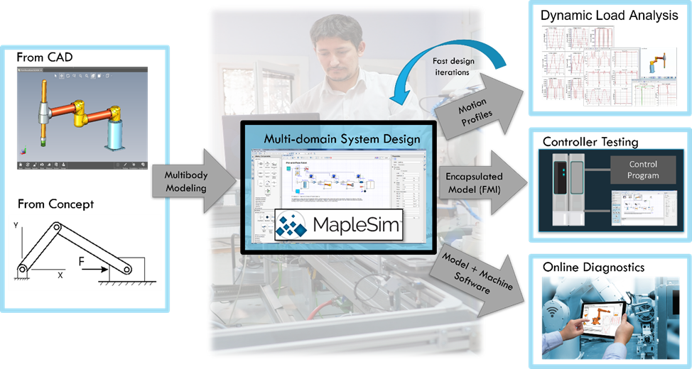 Machine builders use system-level models at the early stages of automation design to predict operating performance and thus optimize machine responses. Using MapleSim, Maplesoft’s flexible multidomain platform, designers can create a high-fidelity virtual prototype of the machine that can be run through testing and simulation scenarios before a physical prototype is built.