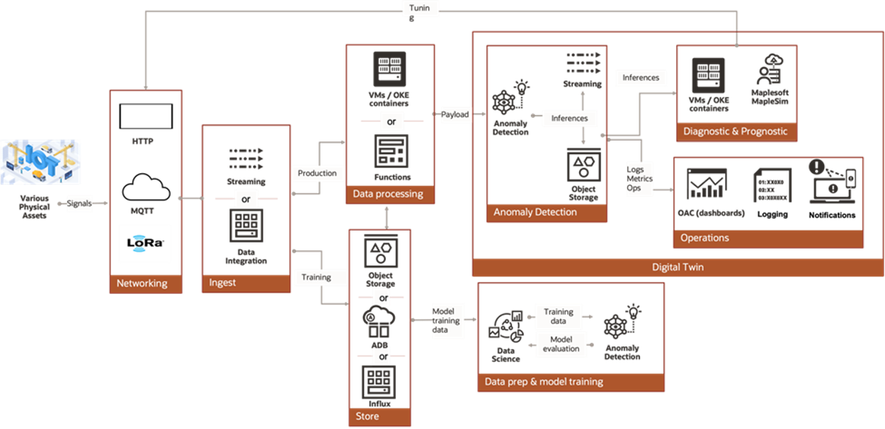 - OCI Anomaly Detection, Streaming, and data sources, such as Object Storage and Autonomous Database, can be used for collecting real-time data from assets to monitor their health and performance.