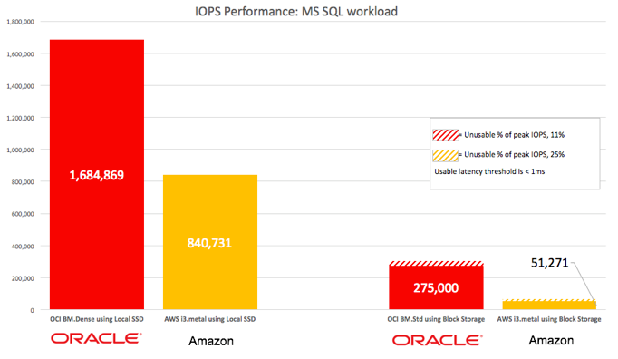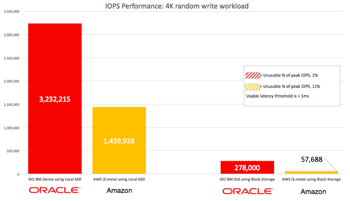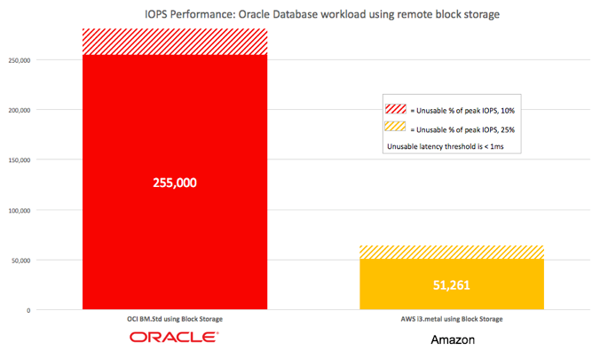 One of the key things that you can see in the performance comparison for remote block storage is that a higher percentage of the IOPS Oracle delivers is usable, with latency below 1 ms, the common threshold for application latency tolerance. In this graph, the percentage of unusable IOPS of the peak recorded for Oracle is 10%, while Amazon records 25% of its peak IOPS at unusable latency levels, both represented by the hashed bars at the top of the peak IOPS levels. Higher levels of latency contribute to variability of performance at high levels of performance. Part of Oracle’s design point in cloud is to cap performance before latency becomes a major issue, making the performance we deliver less variable, delivering better results for critical workloads that need consistency as much as they need high performance.