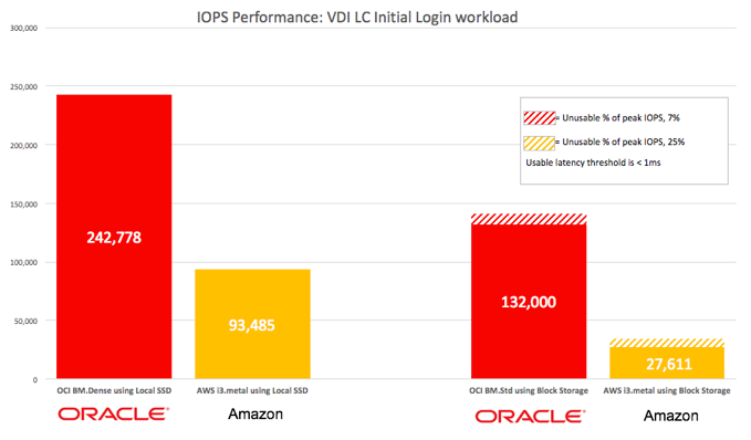 And finally, this is how it broke down for a virtual desktop infrastructure (VDI) workload, a test of initial login, with Oracle showing 2.6X the performance on local SSD and almost 5X with remote block storage: