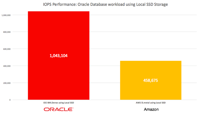 With the local SSD configuration, the Oracle performance advantage for Oracle Database workloads is slimmer, but still significant. In this case, Oracle provides double the performance, but also gives customers more than 3X the local storage capacity, making this extremely high performance configuration far more usable for workloads that need to scale capacity over time. The comparative performance for local storage configurations can be seen here: