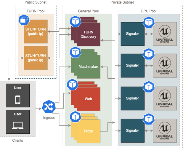 For a more complex deployment, think of the metaverse where each user needs to control their avatar in some way, requiring a separate session with a matchmaking server involved. To set up an Unreal pixel streaming application in OCI in an autoscaling manner with matchmaker, using Oracle’s Container Engine for Kubernetes (OKE), you can use this Quick Start can be used, as shown in Figure 3.