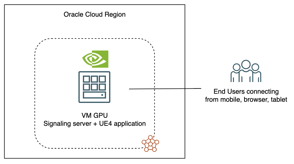 For the simplest scenario, consider a use case where you need multiple users to connect to a single stream with the same session and share viewpoints and controls. Think of a virtual art room where multiple users can all see and interact the same view but can’t manipulate any components in the art room. You can accomplish this scenario using a single VM running in OCI, running both the signaling server and the application, as Figure 2 shows.