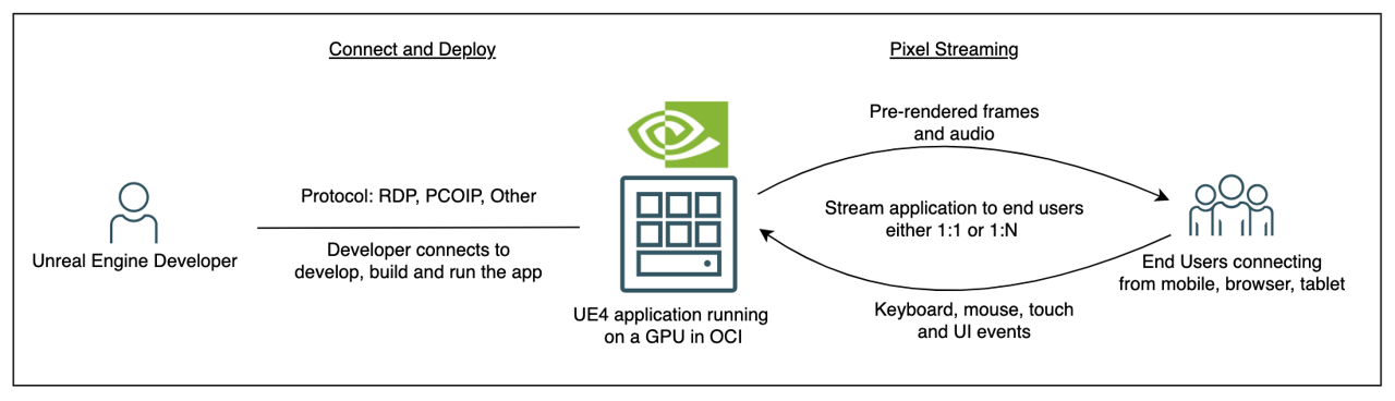 Combining GPUs on OCI with Pixel Streaming, you can interact with 3D applications deployed in the cloud using their normal mouse and keyboard. An Unreal developer logs on to a GPU instance to develop and deploy an Unreal application. The end users then connect and interact with the application when ready. The following graphic shows the high-level architecture of the process: