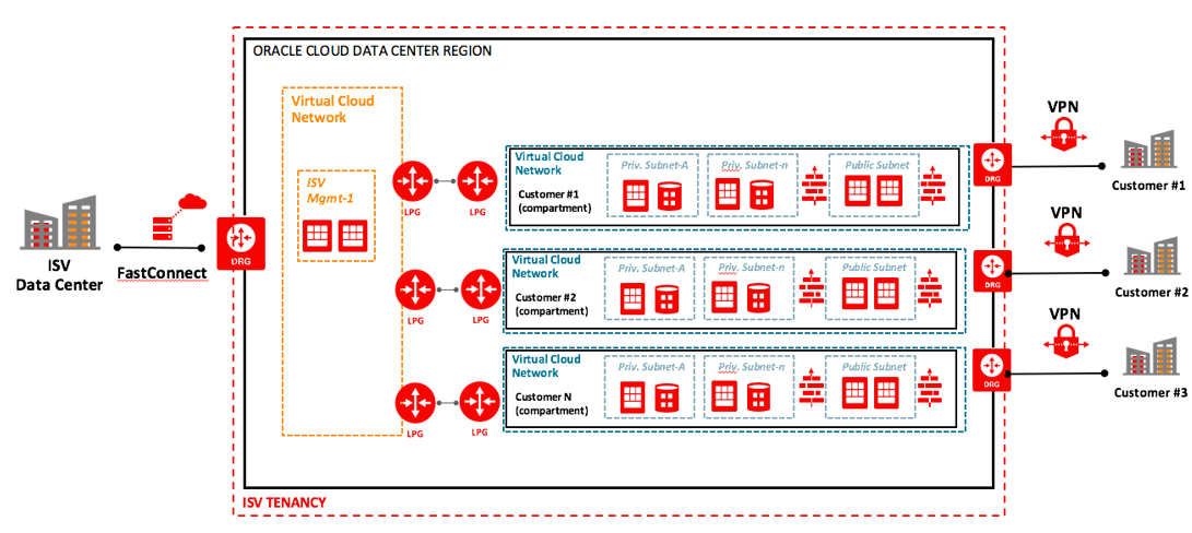 The following diagram shows a single tenancy ISV design utilizing VCNs (Virtual Cloud Network) for customer segregation. More details around the architecture can be found here – ISV architecture blog