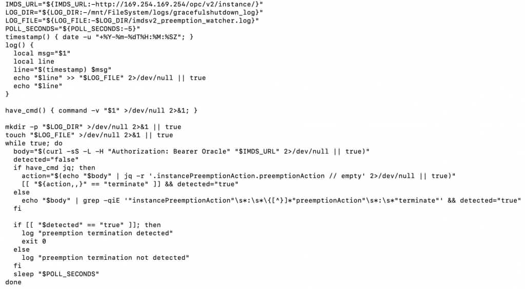 The following example demonstrates how an in-instance daemon can detect preemption events and persist timestamps to File Storage: