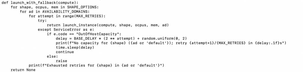 Example above is designed for a maximum of 3 retries of a shape in SHAPE_OPTIONS (in this case E3, E4 and E5) in each AD. If all capacity options are exhausted, Functions’ scheduler feature can periodically reconcile desired vs. actual instance counts and relaunch missing nodes.