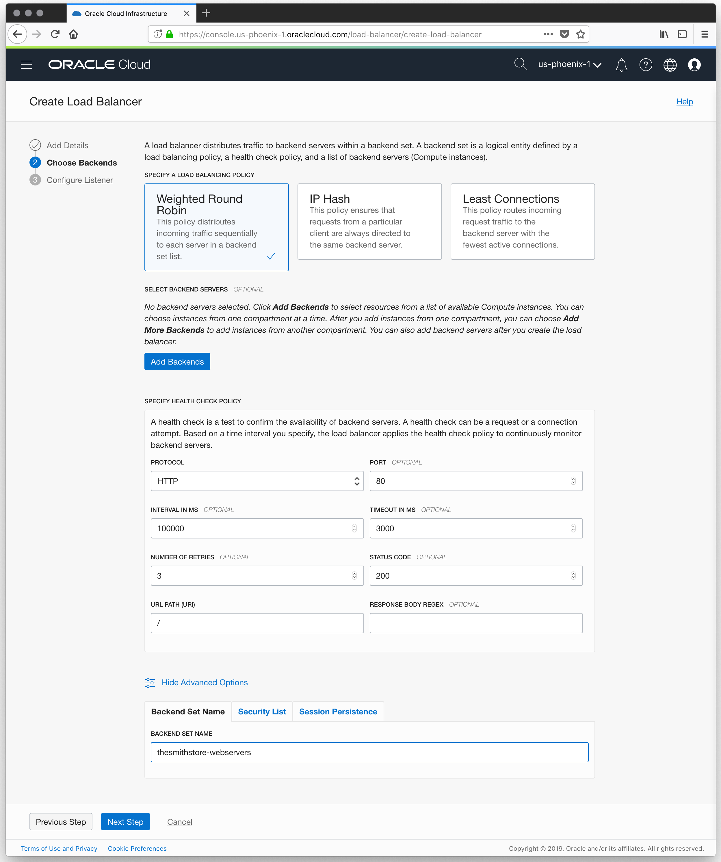 TheSmithStore uses the weighted round-robin distribution. The instance pool created in Part 4 of this series attaches as a backend set for this load balancer. The default check to determine the health of backend servers is sufficient for TheSmithStore.