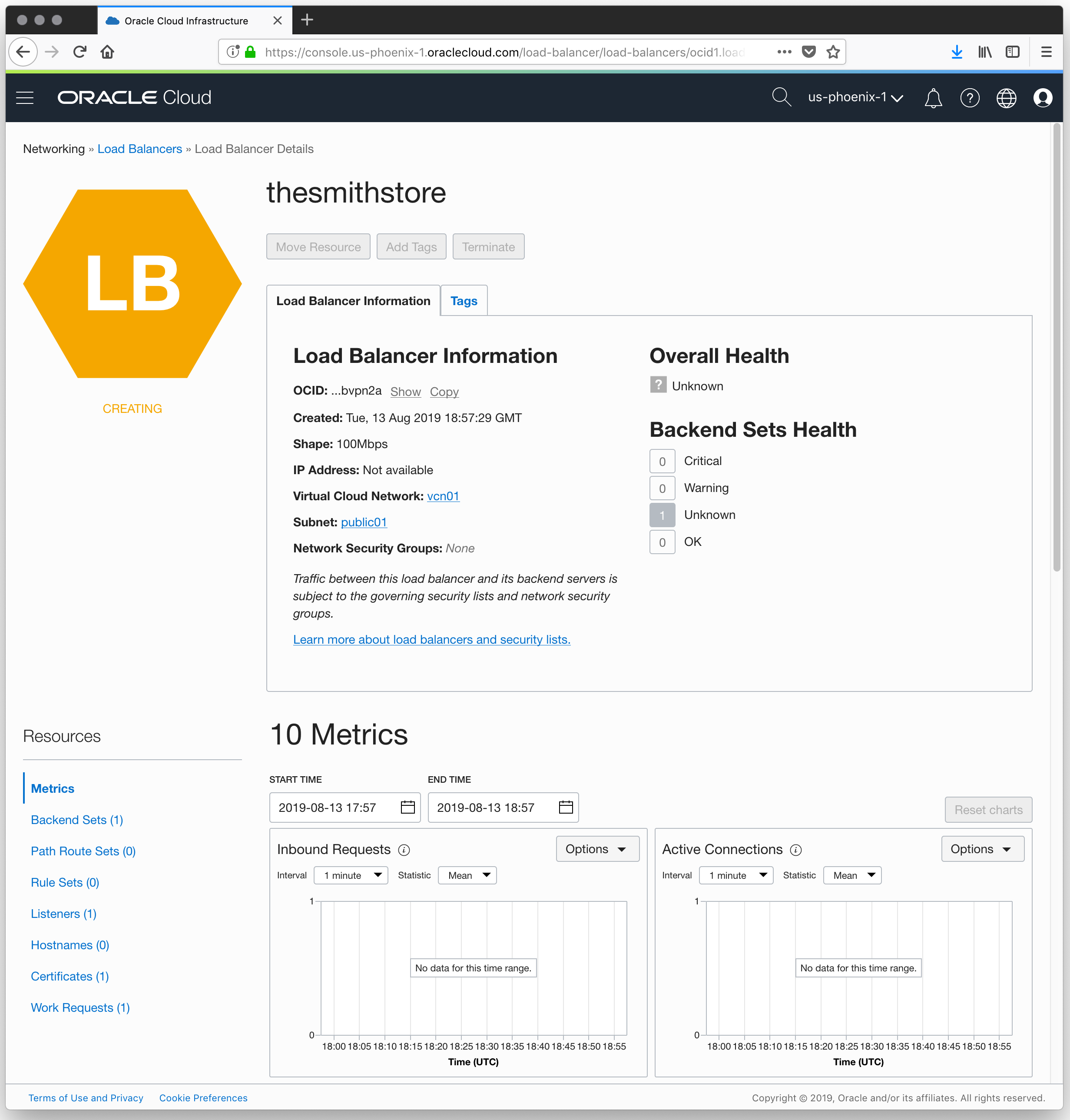 The load balancer is the public endpoint that web requests from TheSmithStore customers hit first. Until backend servers are attached to the load balancer, connections receive a 502 Bad Gateway error, and the overall health of the load balancer is Unknown. In Part 4 of this series, the backend set attaches to an instance pool that is managed by an autoscaling configuration. Before that, Part 3 covers a few things to consider when using Compute autoscaling.