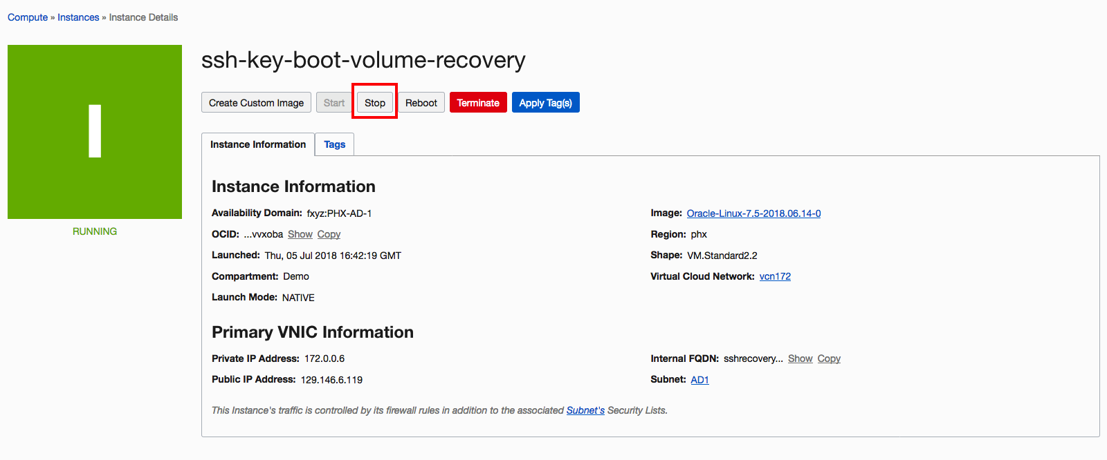 1. Stop the instance that you can’t connect to. In the Oracle Cloud Infrastructure Console, go to the details page for the instance and click Stop. More details in “the public documentation.