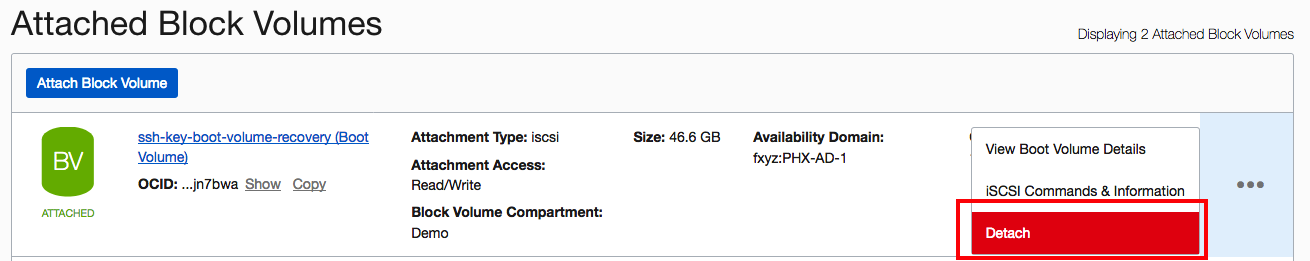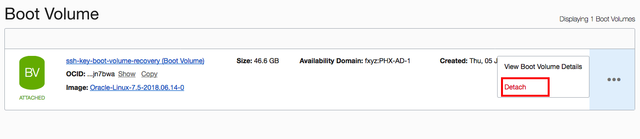 2. Detach the boot volume. In the Boot Volume section, click the Actions icon and choose Detach. See “Detaching a Boot Volume” for additional details if needed.
