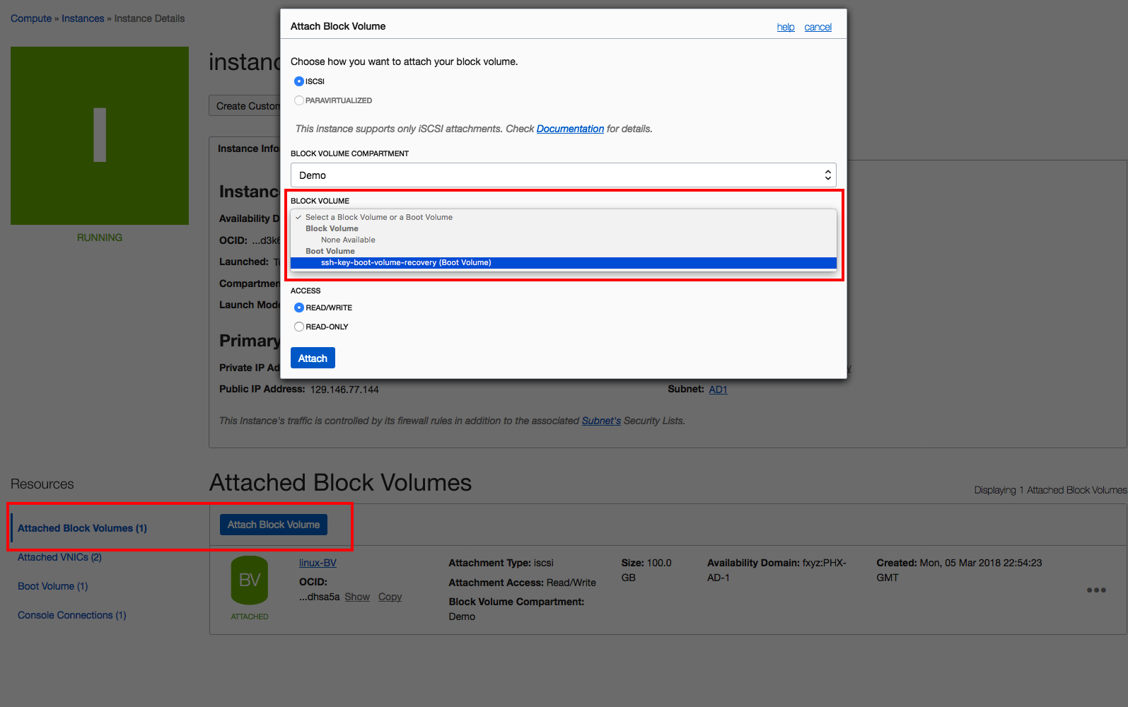 3. Attach the boot volume to another Linux instance by going to the details page of a different VM, clicking Attach Block Volume, and then selecting the boot volume that you just detached in the previous step. Be sure to select Read/Write access. For additional details see “Attaching a Boot Volume” option available in the public documentation portal.