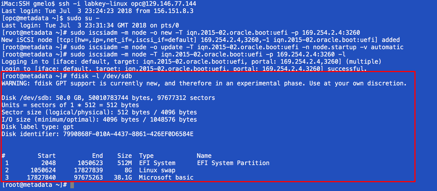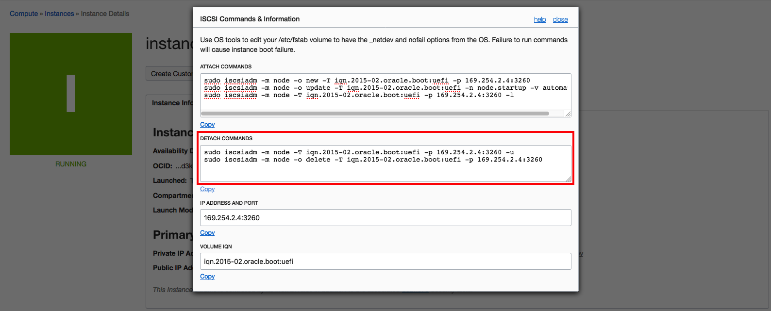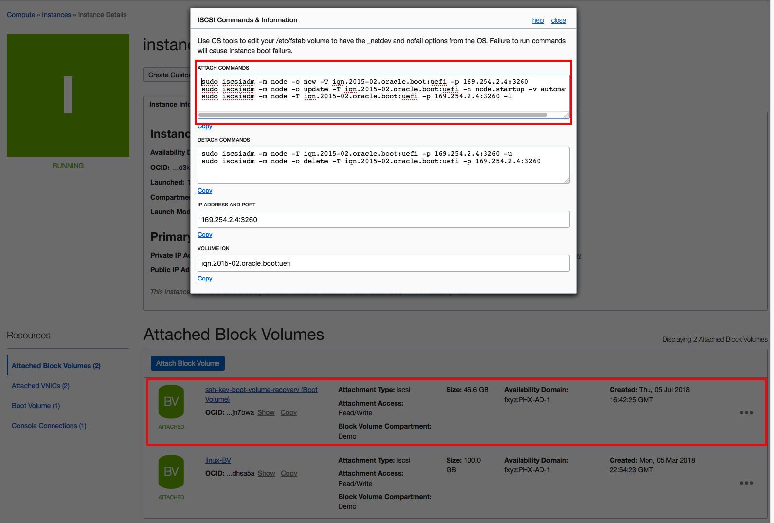 4. After the boot volume attachment is completed (the BV icon is green), connect through SSH in the running VM and run the iSCSI commands to make that new disk available and visible by the OS.