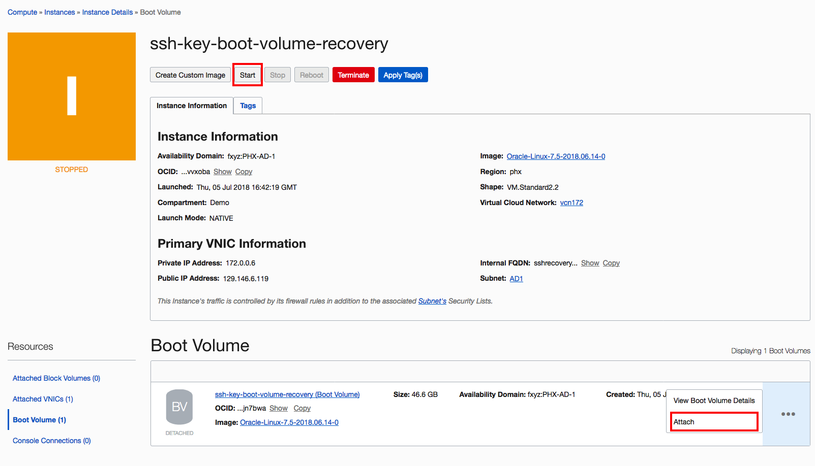 10. Reattach the boot volume to the instance where you wanted to recover the SSH key, wait for it to become operational (green icon) and start it.
