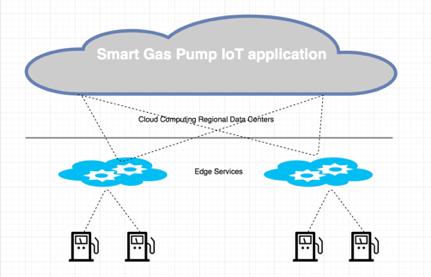 The IoT application for this use case comprises sensors installed at gas pumps to measure oil surface temperatures and to detect any significant spill. The data is uploaded to the edge services for normalization before transmitting to the Oracle Cloud Infrastructure region for processing, where the IoT processing and analytics applications are running.