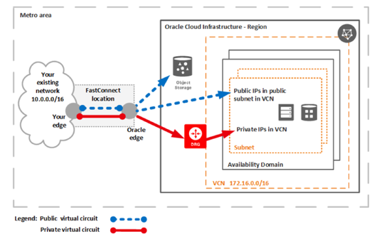 Connect edge service resources via FastConnect to access public services in Oracle Cloud Infrastructure without using the internet (for example, Object Storage, the Oracle Cloud Infrastructure Console and APIs, or public load balancers in your VCN). Communication across the connection is with IPv4 public IP addresses. Without FastConnect, the traffic destined for public IP addresses would be routed over the internet. With FastConnect, that traffic goes over your private physical connection.