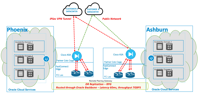 Customers should provision dual circuits or IPSec VPNs using SDN routers on each of the transit PoPs. On the backend, the Oracle Cloud Infrastructure team would establish connectivity from the customer routers to the Oracle Cloud Infrastructure PoP routers by using cross-connect or peering points. Each transit PoP is connected to all three availability domains (datacenters) in the region.