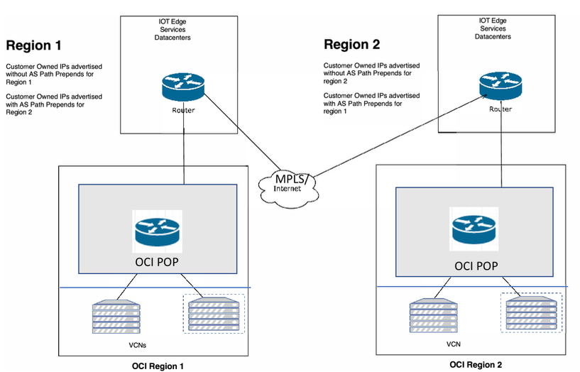 This blog post specifically explores how to use Border Gateway Protocol (BGP) for resiliency and high availability for IP-based applications (not DNS-enabled) hosted in Oracle Cloud Infrastructure diverse regions. The scope is limited to IPv4 addresses, but the solution presented also works for IPv6 services with some additional configuration. Most of these applications fall in the IoT application domain.