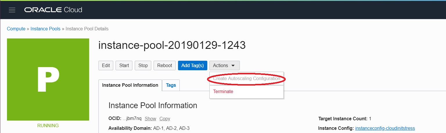 1. On the Instance Pools Details page, click Create Autoscaling Configuration.