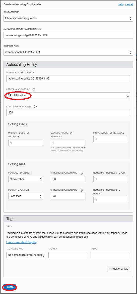 2. In the Create Autoscaling Configuration dialog box, enter the configuration details. For this example, we chose to scale on CPU metrics, set the scale-out rule threshold to 90 percent, set the scale-in threshold to 70 percent, and set the max pool size to 6. We already confirmed that we have enough limit to support launching an additional six instances.