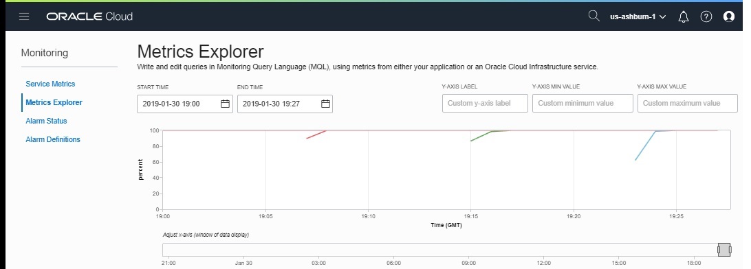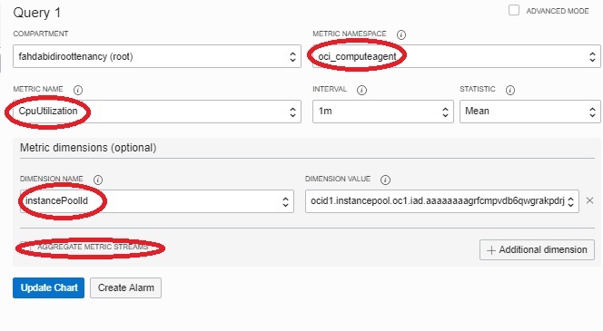 - select your instancepool OCID in the Dimension value and select update chart to display metrics from the instances in your pool.